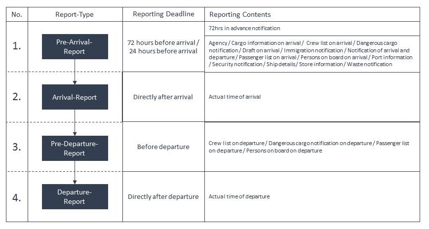 A port call contains arrival, port stay, shifting and departure. For every Danish port call by an oceangoing-vessel two reference numbers get created – one for arrival and one for departure. The creation of an arrival-ID and a departure-ID requires a notification for each.